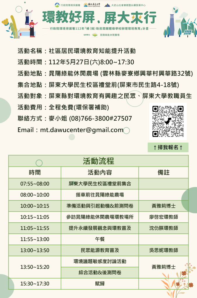 3.若對有關活動報名相關資訊有疑問,請洽國立屏東大學大武山社會實踐暨永續發展中心 麥小姐